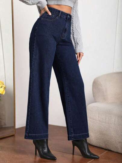 SHEIN Essnce Simple Solid Color Denim Pants, Fashion For Summer Wide Leg Jeans Women - Dark Wash - View 1