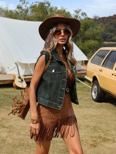 SHEIN Essnce Sleeveless Button-Up Denim Jacket - Dark Wash - View 1