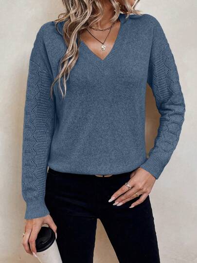SHEIN Essnce V-Neck Drop Shoulder Casual Sweater - Blue - View 1