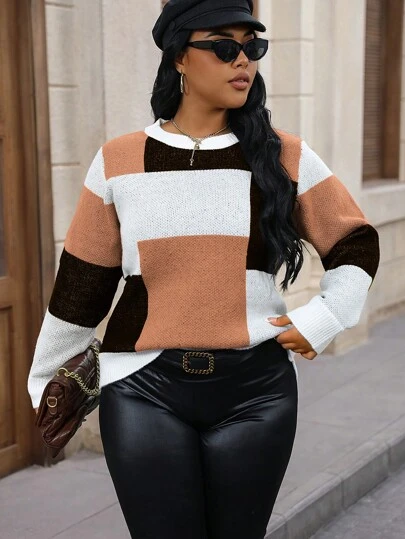 Calvaya Women's Plus Size Contrast Color Round Neck Casual Sweater - Multicolor - View 1