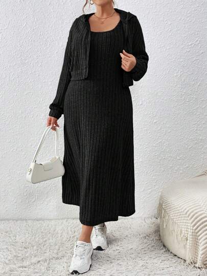 SHEIN Essnce Women's Plus Size Solid Color Ribbed Casual Suit - Black - View 1