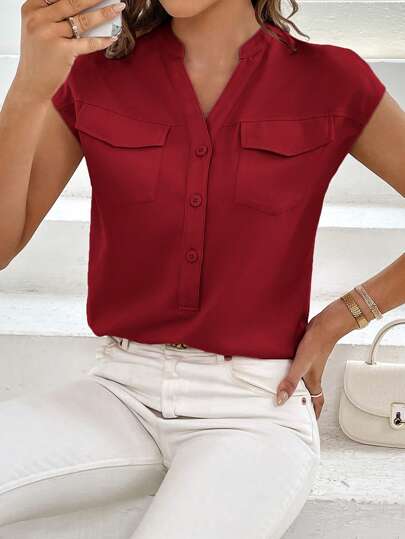 SHEIN Essnce Women's Casual & Commute Solid Notched Neck Blouse - Burgundy - View 1