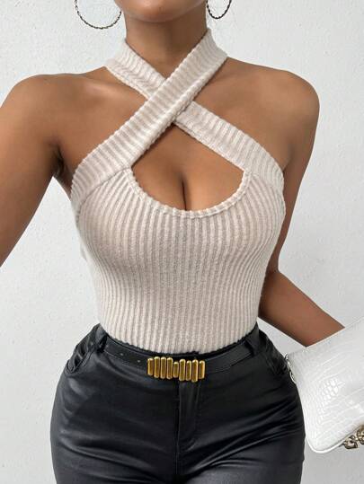 Chiquease Women's Cross Halter Neck Ribbed Tank Top - Apricot - View 1