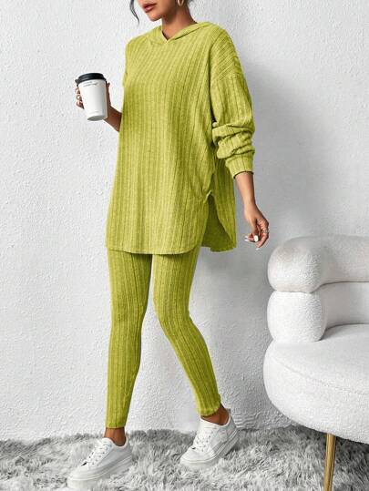 SHEIN Essnce Women Outfit Sets Black Velvet Sweatshirt Hooded Long-Sleeved Warm Tight Leggings Women's Casual Striped Hooded Top Leggings Winter - Lime Green - View 1