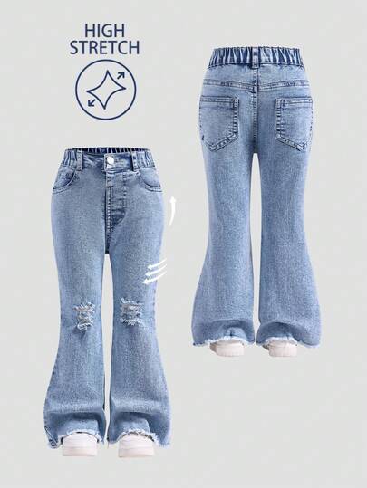SHEIN Explorewe Young Girls' Distressed Skinny Fit Elastic Denim Jeans, Washed Light Blue, Casual & Fashionable Fall Winter Baggy Jeans Y2k Bellbottoms Jeans - Light Wash - View 1