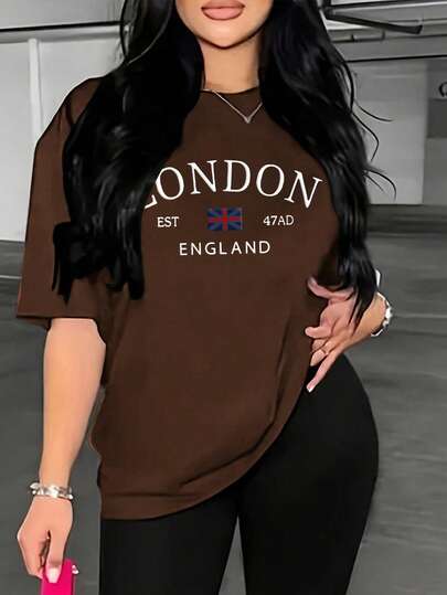 SHEIN Fashionable Casual New Khaki Short Sleeve Front Leopard & Butterfly Print Women T-Shirt - Brown - View 1