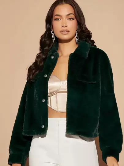 SHEIN Flap Detail Fuzzy Coat - Dark Green - View 1