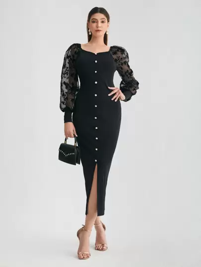 SHEIN Flocked Floral Organza Lantern Sleeve Slit Hem Dress - Black - View 1