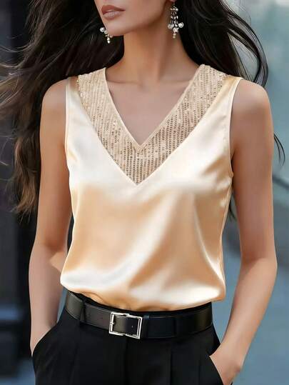 SHEIN Franclia Women's French-Style Elegant Woven Satin Satin Champagne Color Solid Color Patchwork Sequin V-Neck Women's Elegant Vest, Gentle And Elegant, Women's Elegant Vest, Women's Elegant Clothing, Sequin Vest, Sparkly Top, Summer Vest, Summer Top, Summer Outfit, New Summer Women's Vestfashionable Casual Commuter Wear, Business Office Wear, Versatile And Stylish Everyday Casual Wear, Urban Teacher's Professional Attire - Champagne - View 1