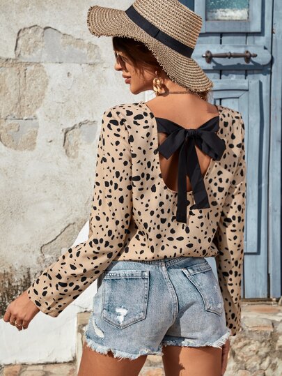 SHEIN Frenchy Dalmatian Print Tie Back Blouse - Apricot - View 1