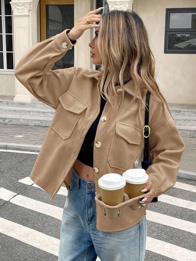 SHEIN Frenchy Flap Pocket High Low Hem Overcoat In Fall/Winter Brown - Khaki - View 1