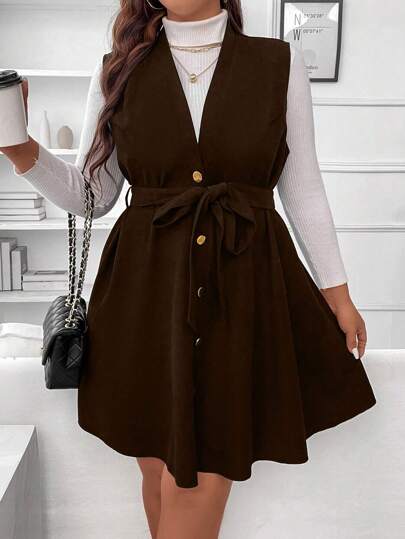 SHEIN Franclia Plus Button Front Sleeveless Belted Dress Without Sweater - Brown - View 1