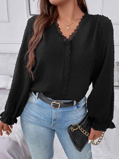 Franclia Plus Swiss Dot Guipure Lace Trim Flounce Sleeve Blouse - Black - View 1