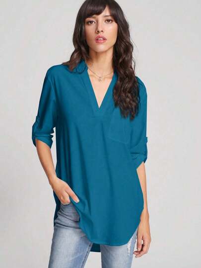 SHEIN LUNE Roll Up Sleeve Curved Hem Longline Blouse - Blue - View 1
