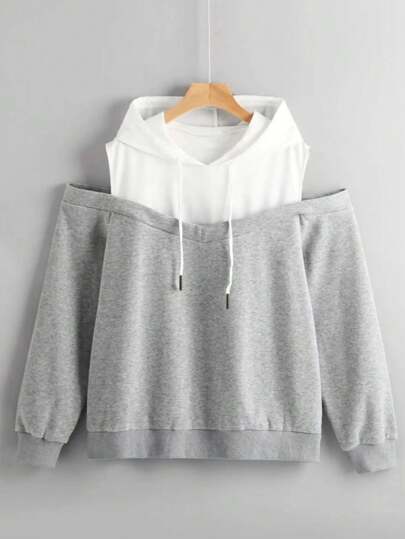 Chiquease Two Tone Cold Shoulder Drawstring Hoodie - Multicolor - View 1