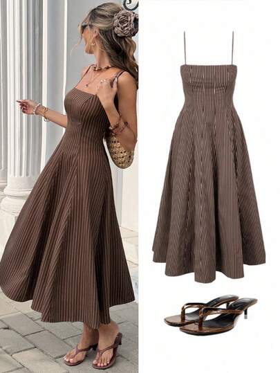 SHEIN Frenchy Women's Casual Striped Spaghetti Strap Mid-Length Dress - Brown - View 1