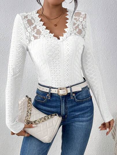 SHEIN Frenchy Women's Lace Patchwork Hollow Out Embroidered Textured Fabric White T-Shirt Winter Casual Spring - White - View 1