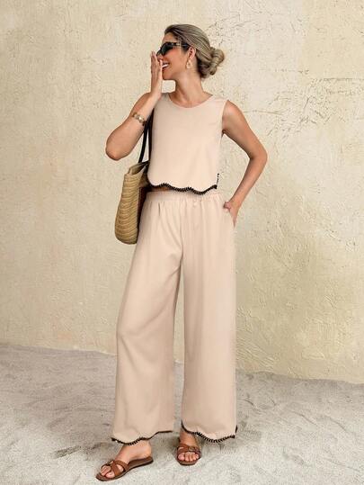 SHEIN Frenchy Women's Vacation Round Neck Curved Hem Tank Top And Wide Leg Pants Casual 2 Pieces Set - Apricot - View 1