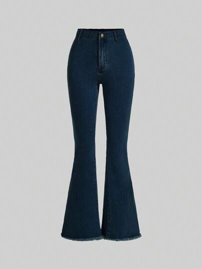 SHEIN Girlism Teen Girl's Simple Style Flare Jeans With Front Buttons And Back Pockets, Suitable For Daily Casual Wear - Dark Wash - View 1