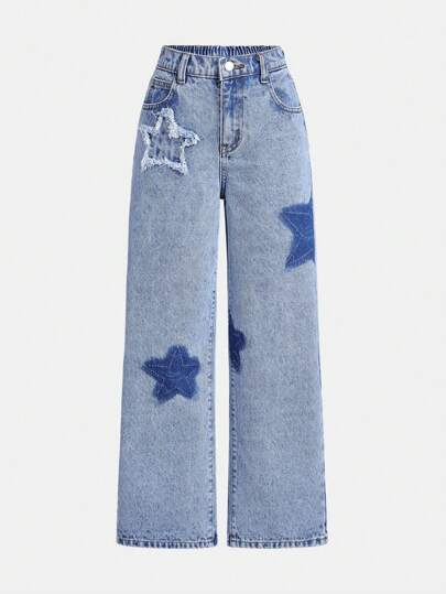 SHEIN Girlism Tween Girls' Cute Starry Pattern Washed Straight-Leg Jeans - Medium Wash - View 1