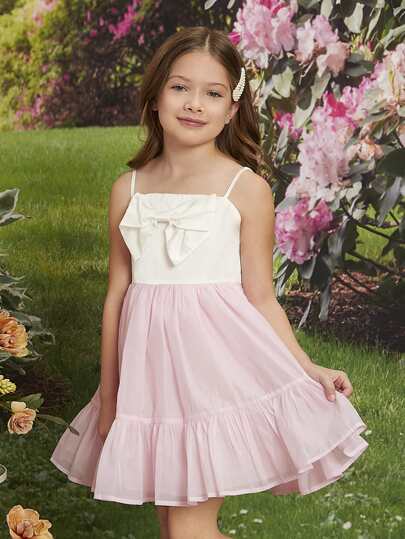 SHEIN Girls Color Block Bow Front Ruffle Hem Cami Dress - Multicolor - View 1