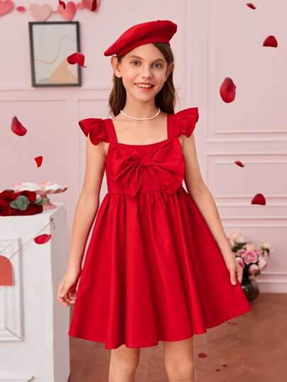 SHEIN Girls 1pc Ruffle Trim Bow Front Dress - Red - View 6