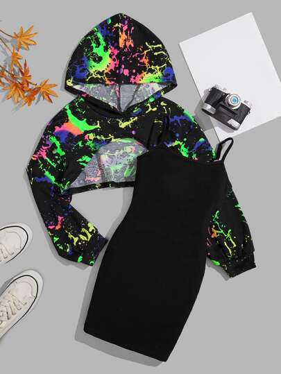 SHEIN Tween Girl Reflective Splash Ink Print Super Crop Hoodie & Cami Dress - Black - View 1