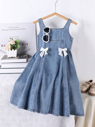 SHEIN Girls' Stylish Denim Suspender Dress, Soft Washed Denim Princess Dress, Summer New Design - Blue - View 1
