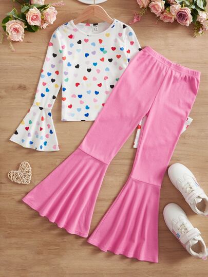 SHEIN Girls Heart Print Flounce Sleeve Tee & Flare Leg Pants - Multicolor - View 1