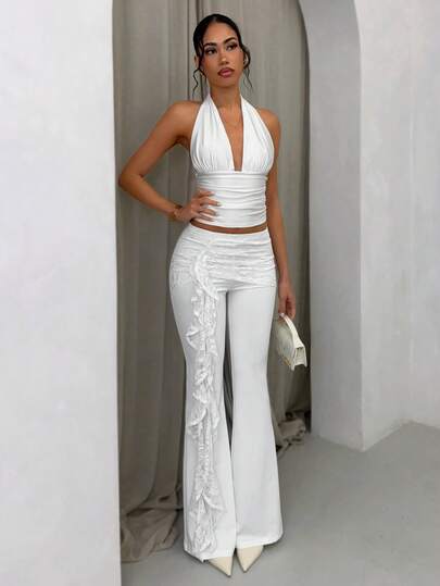 SHEIN Glamour Women's Elegant White Slim-Fit Lace Patchwork Ruched Long Pants, Suitable For Spring/Summer Vacation,Beach Vacation Outfit,Summer Outfits - White - View 1