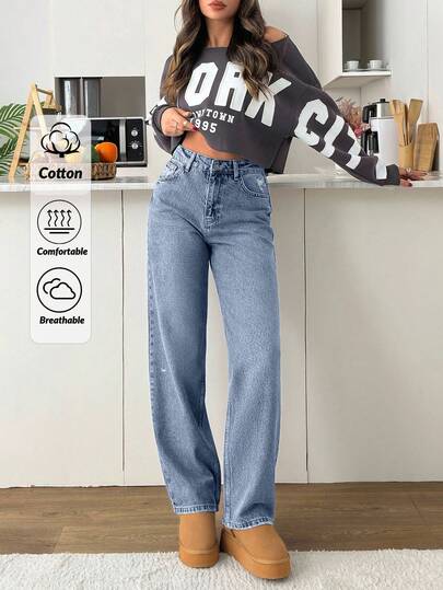 EURMUSE High Waist Wash Detailed Straight Jean - Medium Wash - View 1