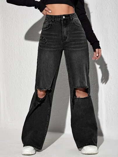 SHEIN EZwear High Waisted Ripped Wide Leg Jeans - Black - View 1