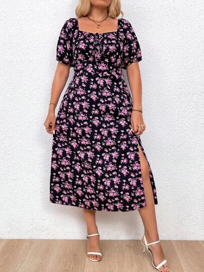 SHEIN Holidaya Plus Size Floral Print Holiday Style Square Neck Side-Split Dress - Violet Purple - View 1