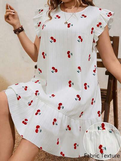 Breezaya Đầm dạ hội cỡ lớn màu trắng nhăn, in họa tiết quả anh đào lãng mạn, tay bồng, dáng chữ A, thanh lịch, thích hợp cho kỳ nghỉ.