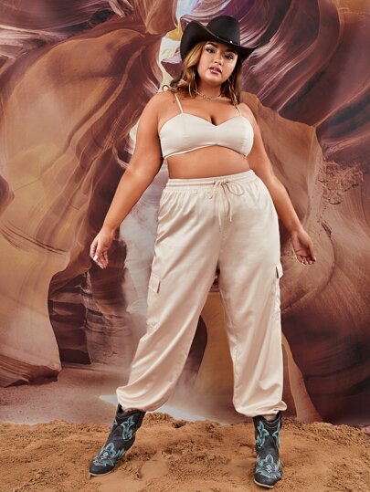 SHEIN ICON Plus Cami Top & Drawstring Waist Cargo Pants - Beige - View 2