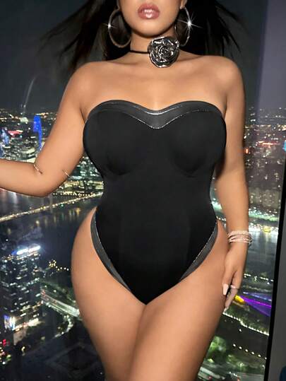 SHEIN ICON Plus Contrast Trim Tube Bodysuit - Black - View 6