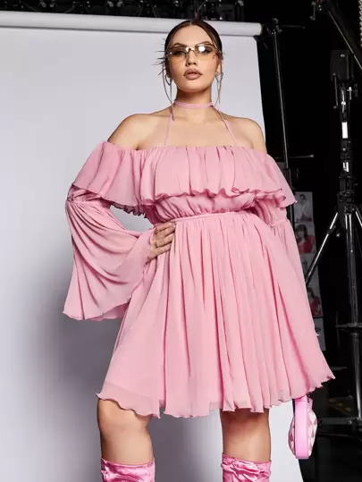 SHEIN ICON Plus Ruffle Trim Flounce Sleeve Halter Off Shoulder Dress - Baby Pink - View 1