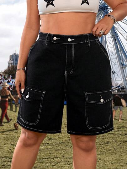 SHEIN ICON Plus Size Denim Utility Bermuda Shorts, Rave Outfits Festival - Black - View 1