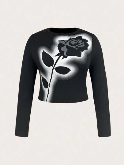 SHEIN ICON Plus Size Floral Print Crew Neck T-Shirt - Black - View 1
