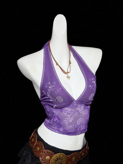 SHEIN ICON Women Slim Fit Spaghetti Strap Backless Tank Top With Flower Mesh And Hot Rhinestones And Neck Tie For Summer - Purple - View 1