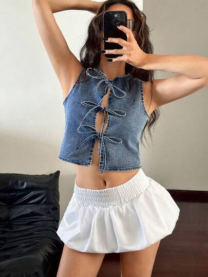 SHEIN ICON Women's Casual Washed Open Front Tied Sleeveless Denim Shirt - Dark Wash - View 1