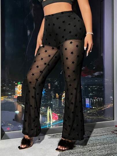 SHEIN ICON Women's Plus Size Star Jacquard High Waist Flared Pants - Black - View 6