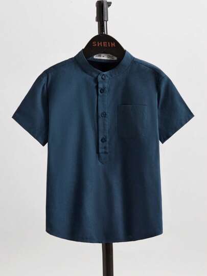 SHEIN Boys Stand Collar Pocket Patch Shirt - Navy Blue - View 1
