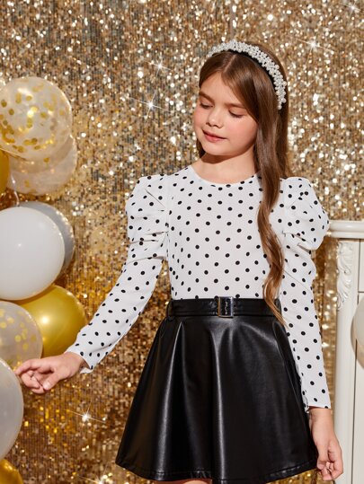 SHEIN Tween Girl Spring/Summer Casual Polka Dot Gigot Sleeve Shirt - White - View 1