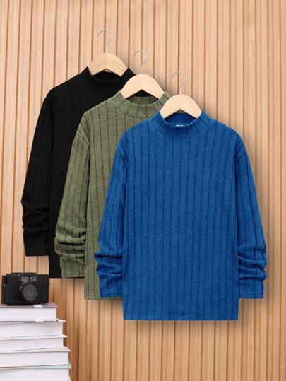 SHEIN 3pcs/Set Tween Boys' Casual Solid Color Half-High Neckline T-Shirt(Top) In Three Colors - Royal Blue - View 1