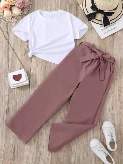 Tween Girl Solid Tee & Belted Pants - Multicolor - View 1