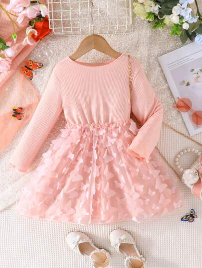 SHEIN Little Girls' Long Sleeve Butterfly Applique Mesh Dress - Pink - View 1