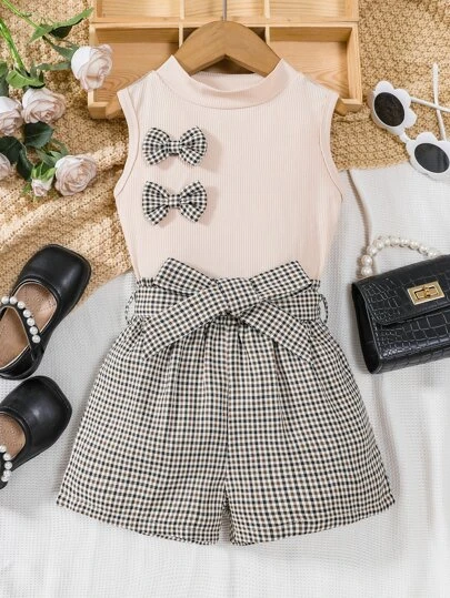 SHEIN Toddler Girls Bow Front Tank Top & Plaid Belted Shorts - Multicolor - View 1