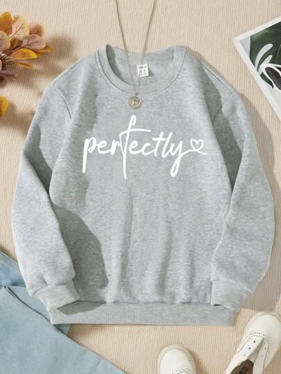 SHEIN Tween Girl 1pc Letter Graphic Thermal Lined Pullover - Light Grey - View 1
