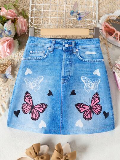 SHEIN Tween Girl's Butterfly Printed Denim Skirt, Summer Casual Style - Blue - View 1